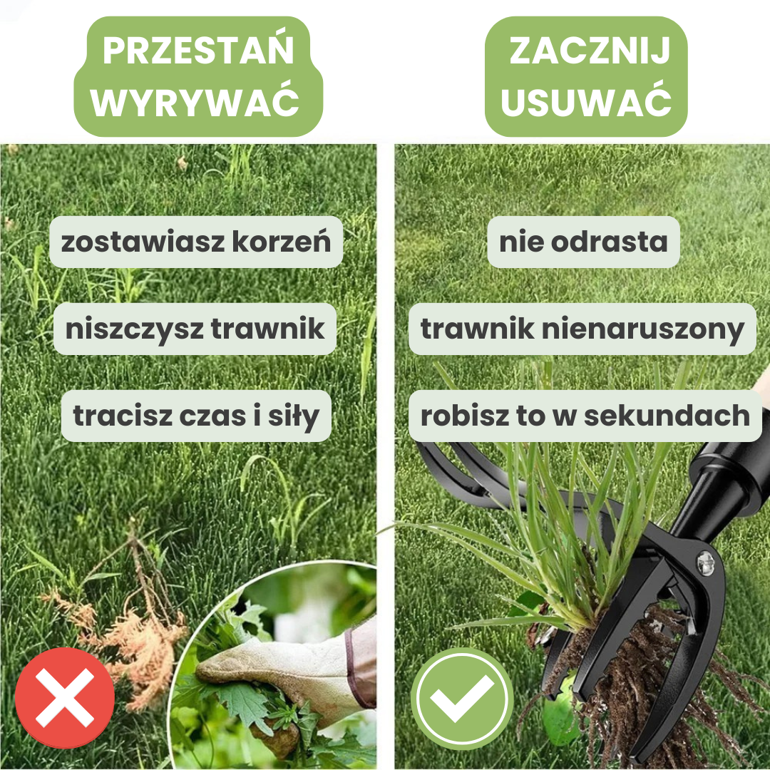 Usuwasz cały chwast zamiast jego części, więc nie wraca po krótkim czasie. Metalowe pazury wbijają się w ziemię i chwytają korzeń przy jednym ruchu.